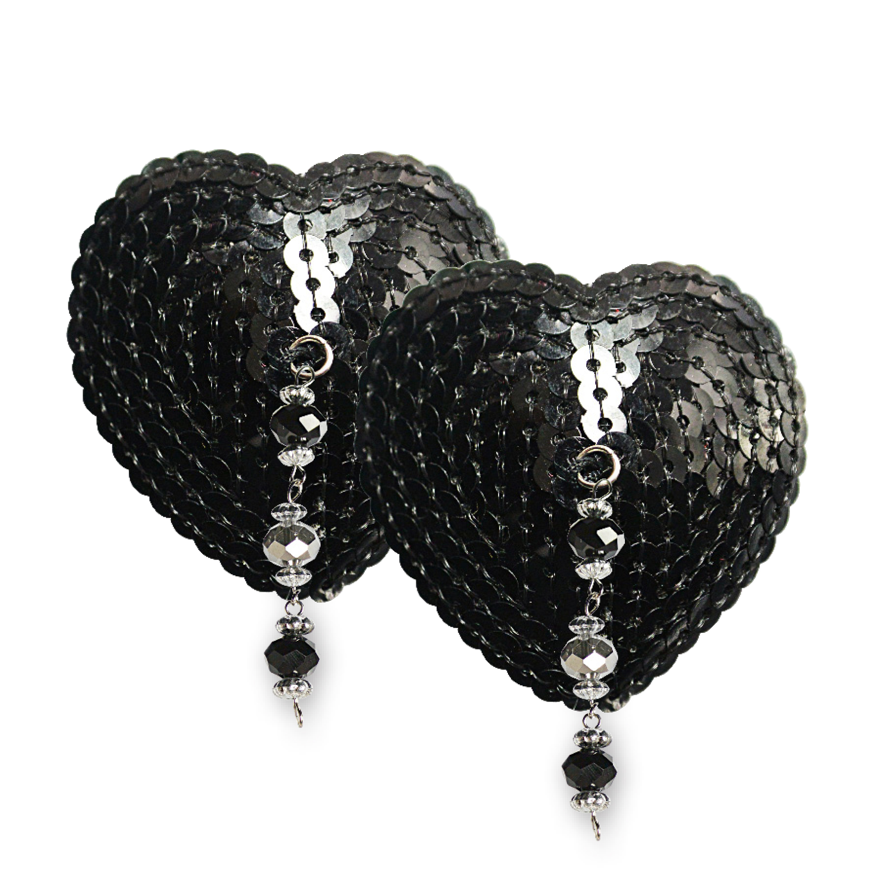These adorable heart shaped pasties are adorned with elegant faceted beads. Part of the “Hearts-A-Fire” collection by Heart to Heart, these sequined encrusted nipple covers are sure to turn a few heads. Available in red and black.
