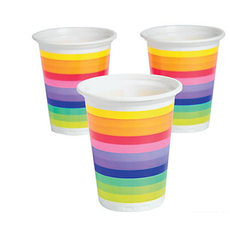 Check out these vibrant 16oz rainbow plastic cups. Perfect for your next pride party, get the matching dinner plates, salad/dessert plates and napkins too!