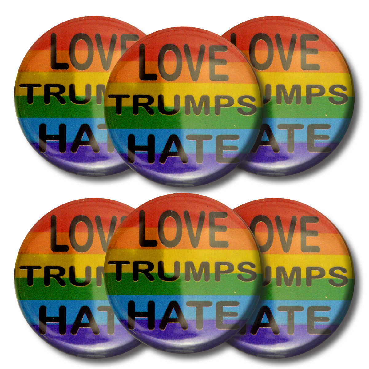 Set LOVE TRUMPS HATE on Rainbow buttons (SET OF 6) 1.25” or 3.175cm pin back button